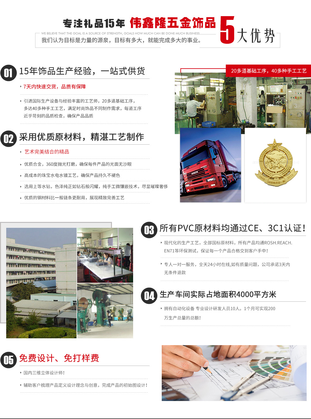 深圳市偉鑫隆五金飾品有限公司位于廣東省深圳市坑梓鎮,是一家集設計、生產、銷售為一體的專業(yè)五金禮品工藝公司。 公司擁有經驗豐富的專業(yè)技術精英團隊,至今已有十多年設計生產經驗。 公司自有工廠引進先進的臺灣設備及技術,擁有設計、繪圖、制模、沖壓、壓鑄、拋光、電鍍、包裝等生產流程,可生產銅、鐵、不銹鋼、鋁、鋅合金、鉛錫合金等材質的金屬徽章、胸針、胸章、獎章、獎牌、金屬標牌、工號牌、金屬鑰匙扣、狗牌、軍牌、開瓶器、金屬手機吊飾、錢夾、領帶夾、帽夾、項鏈吊墜、掛包鉤、紀念章、紀念幣、袖扣、促銷禮品鑰匙扣、書簽、五金配件、開瓶器等旅游紀念品及工藝禮品五金飾品。我公司還可根據客戶樣板開模生產。 公司秉承“精...